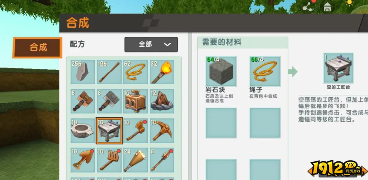6、打开石质工匠台,放入绳子和岩石块,即可得到空工匠台。
