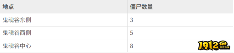 在鬼魂谷中,玩家会遇到不少其他僵尸和怪物,但25级僵尸则主要集中在几个特定的地点。根据我们的观察,下面的表格展示了僵尸的出现地点及其数量: